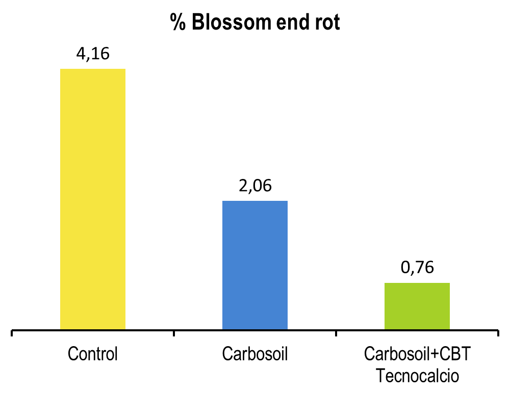 تعفن الطرف الزهري اضطراب فسيولوجي انخفض بنسبة 2.1% مع Carbosoil (تطبيق جذري) وكاد أن يختفي تمامًا (- 3.4%) عند دمجه مع CBT Tecnocalcio (تطبيق ورقي). وازداد المحصول بنسبة 26% مع هذه المعالجات.